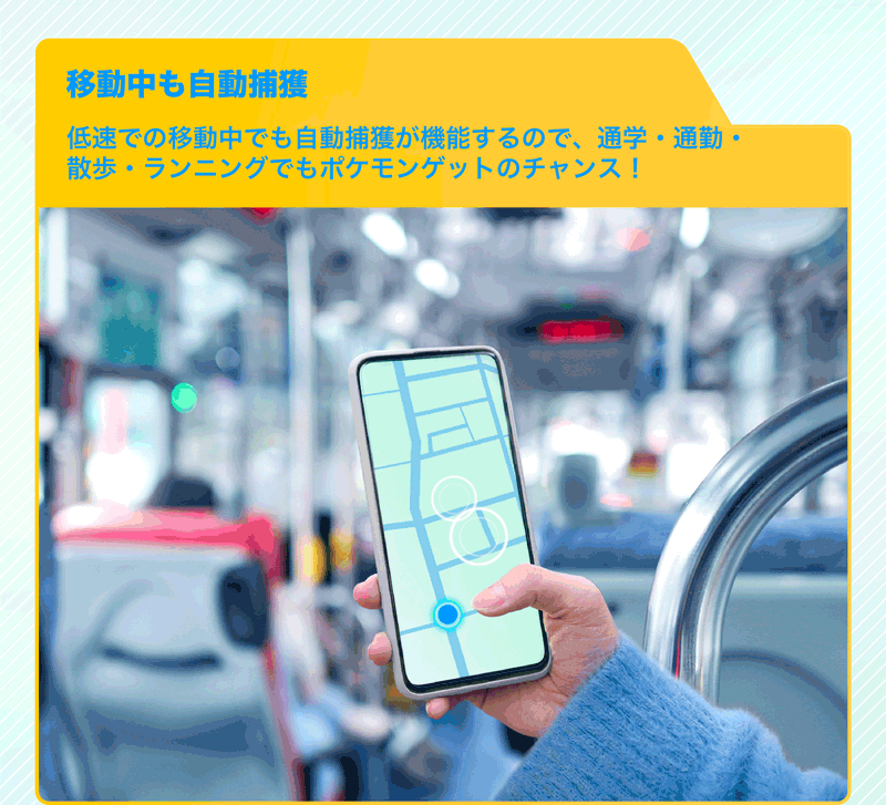 ポケモンを捕獲する平均速度が、6.5秒/頭であり、散歩、ランニンングは勿論、自転車、低速運転中のバスや電車に乗った時でも、ポケモンを捕獲することができます。